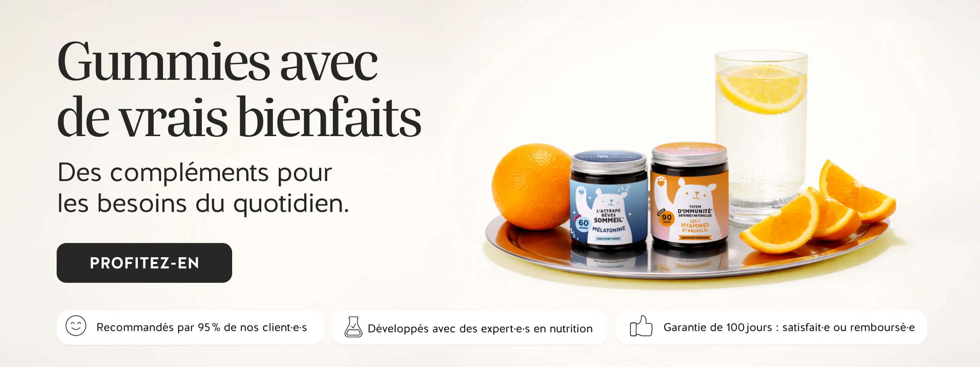 Bienvenue chez Bears with Benefits, vos experts en compléments alimentaires délicieux et efficaces. Chez Bears with benefits nous avons développé des gummies de haute qualité enrichies en actifs innovants. La plupart de nos gummies sont vegan et totalement exempts de tests sur les animaux. En collaboration avec la nutritionniste Dr. Med. Anne Latz et la scientifique en nutrition Nassim Jamalzadeh, nous sommes en recherche constante d’innovation afin de vous assurer le plus haut niveau de qualité. Nous vous offrons une large gamme de produits spécialement adaptée à vos besoins. Que vous souhaitiez renforcer vos cheveux, illuminer votre peau ou améliorer votre santé générale, nous avons le produit parfait pour vous.